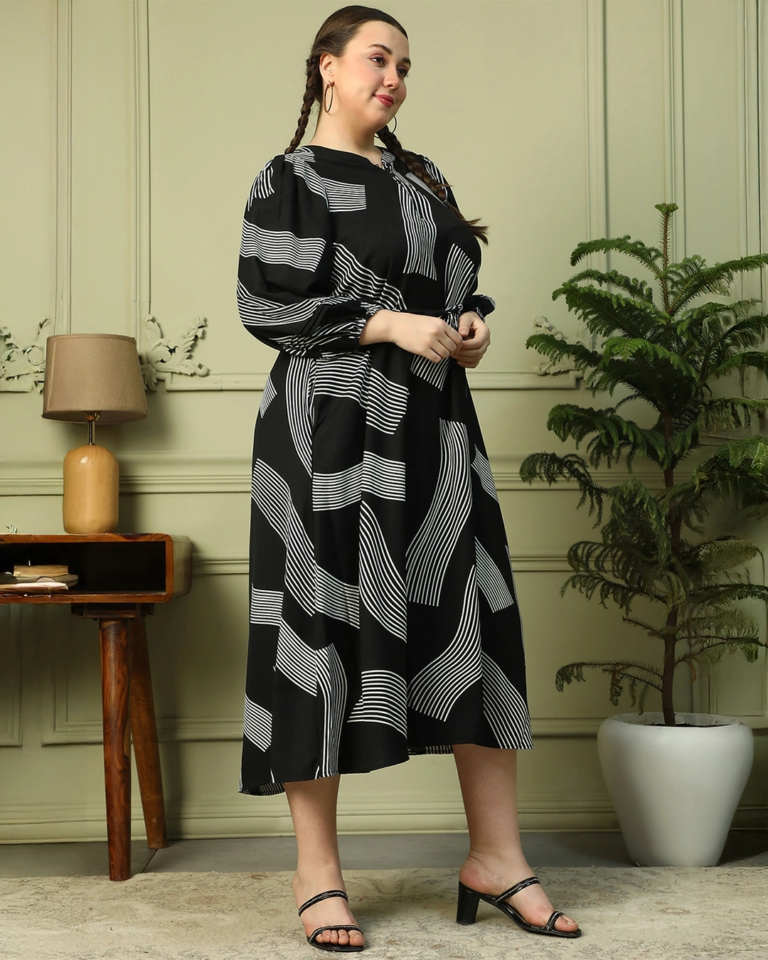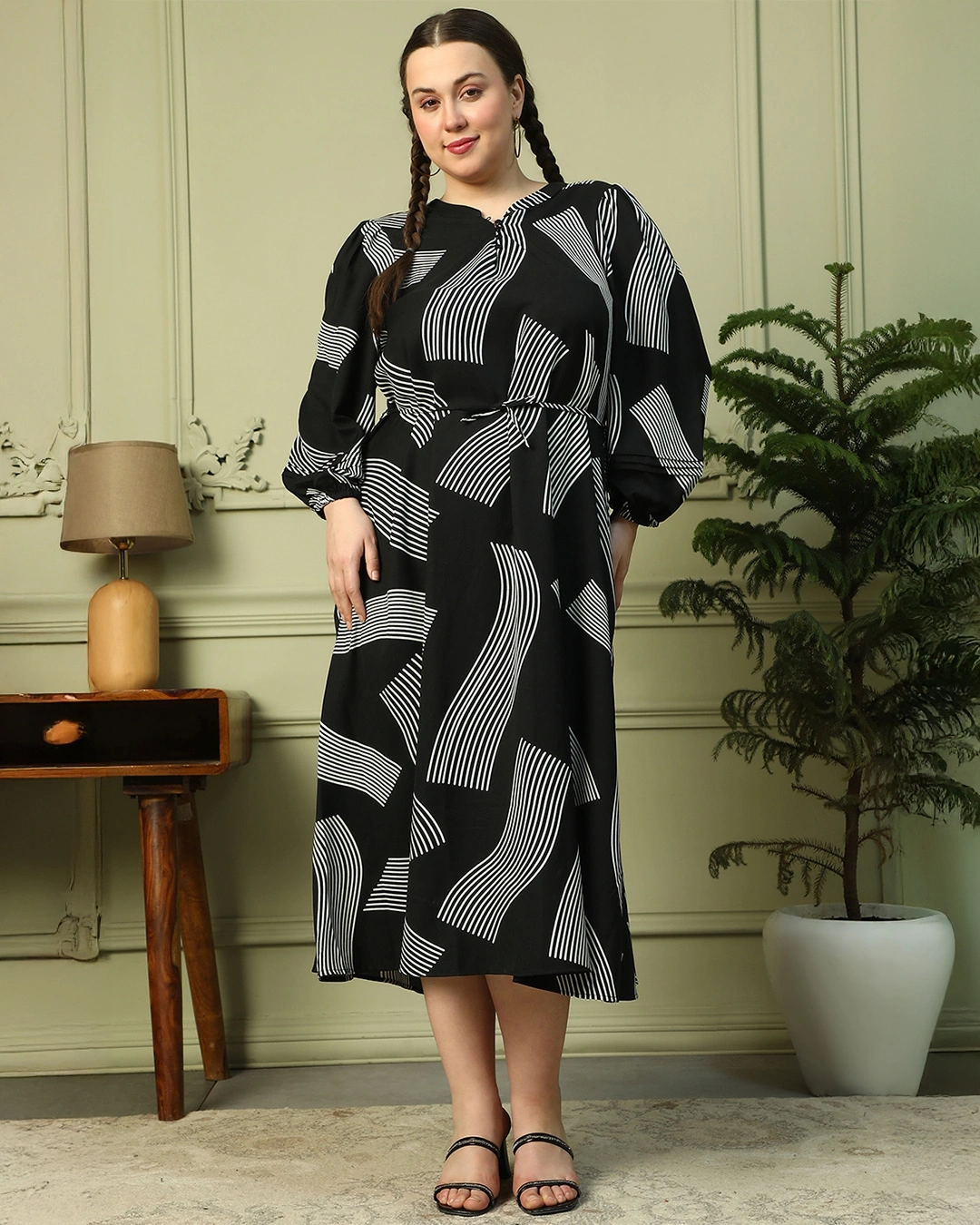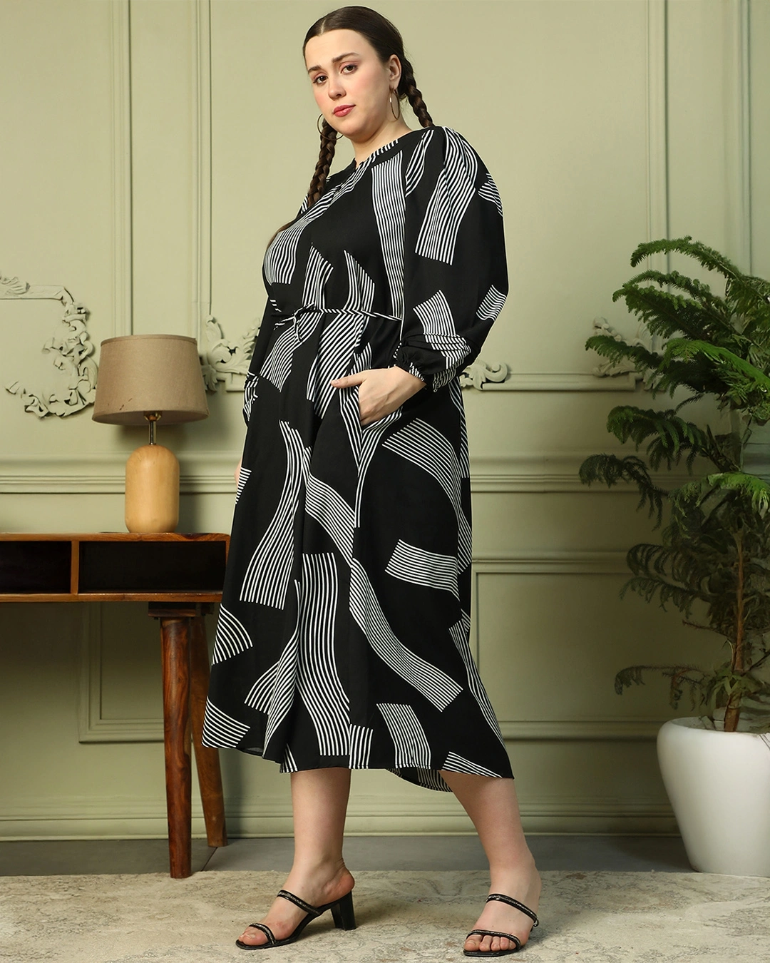 Become the most stylish curvy girl in the Effortless Black Printed Long Sleeve Women Plus Size Maxi Dress With Waist Tie-Up Belt. Made from soft polyester, this dress combines comfort with elegance. The striking printed design and round neckline featuring a button detail provide a contemporary and fashionable appearance. The long flare silhouette flows gracefully, while the waist tie-up belt highlights your curves, creating a flattering and feminine silhouette. Whether you are dressing up for a special event or opting for a casual look, this adaptable dress is an essential addition to every curvy girl’s wardrobe.