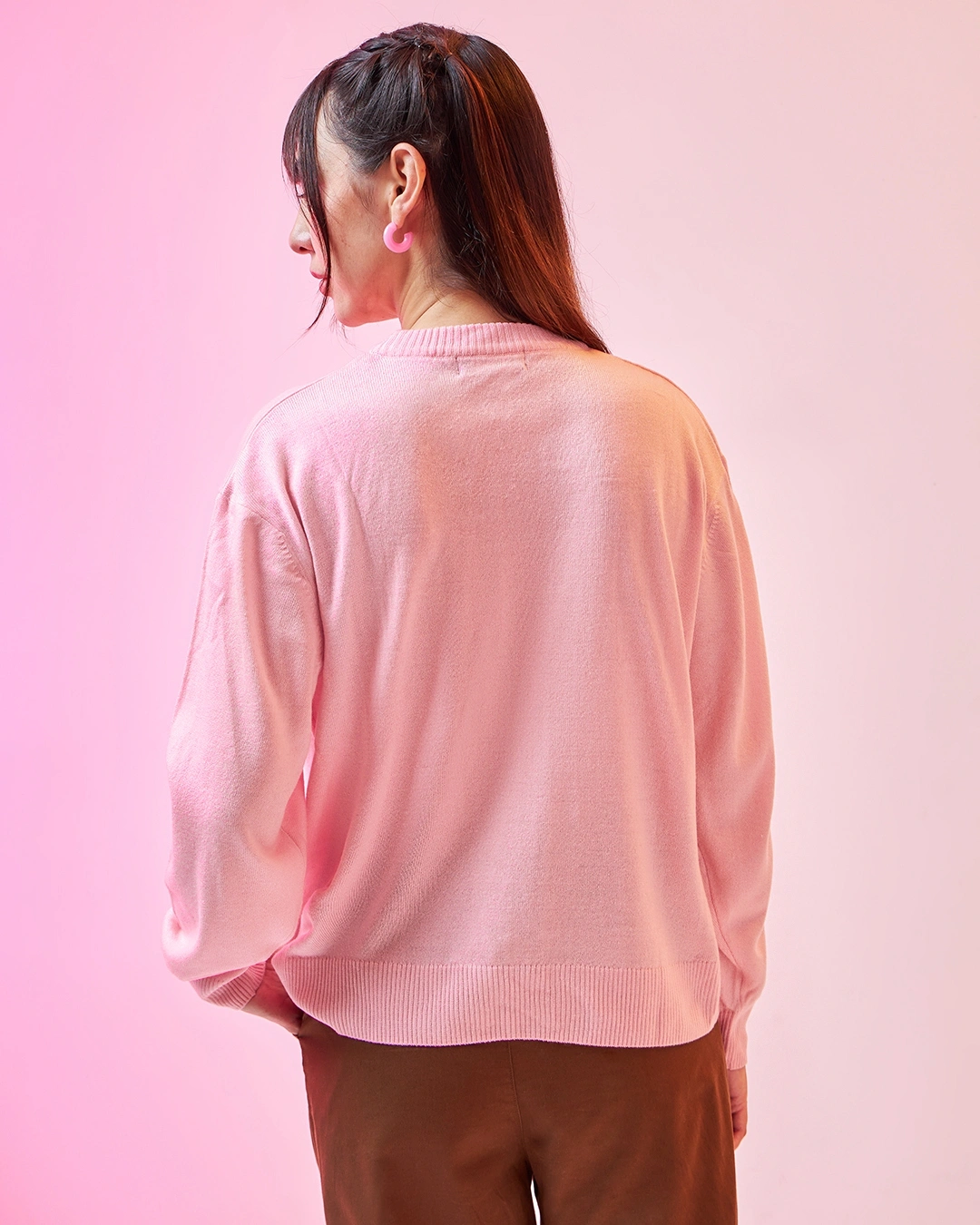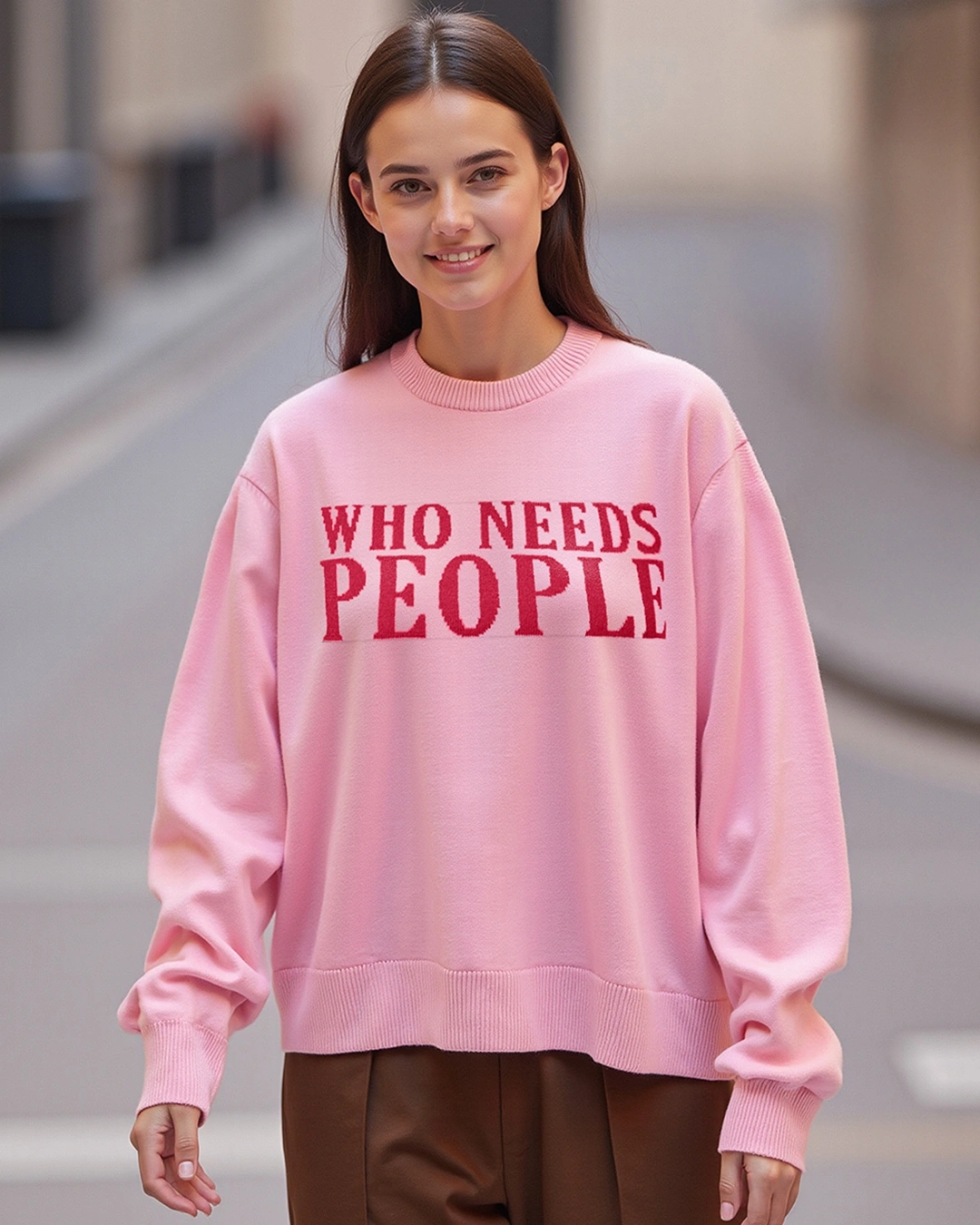 This “Who Needs People” Typography Women’s Pink Super Loose Fit Sweater emphasizes the importance of self-love. Pair it effortlessly with mom jeans and sneakers to achieve a relaxed and charming look.